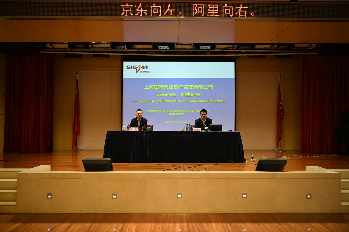 3月21日下午,公司开启了2018年第一场“资管视野—基金投资人行业分享”系列讲座,讲座的主题为“京东向左,阿里向右——从京东一体化的开放和阿里开放的一体化看消费品产业链的变迁”,由雄牛资本创始合伙人及主管合伙人李绪富博士主讲。公司全体员工、控股子公司员工参加了此次讲座,集团公司领导、集团系统员工、金浦、国和、国方基金也应邀参加了此次活动。