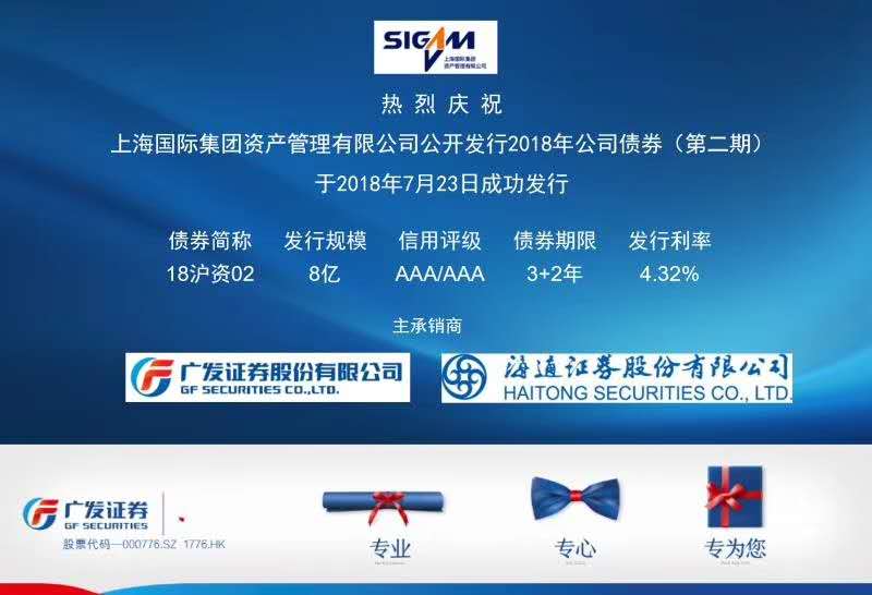 2018年7月23日龙8集团资产管理有限公司在上海证券交易所成功发行8亿元公司债券,期限3+2年。本次发行在公司与主承销商、各投资机构的不断沟通和努力下,发行当天获得包括各大银行及券商、保险、公募基金、信托公司、私募基金等非银机构,合计43家金融机构踊跃参与,合规投标金额达到46.9亿元,全场认购倍数5.86倍,票面利率最终锁定4.32%,为近一年来AAA级同品种同期限产品最低发行价格。