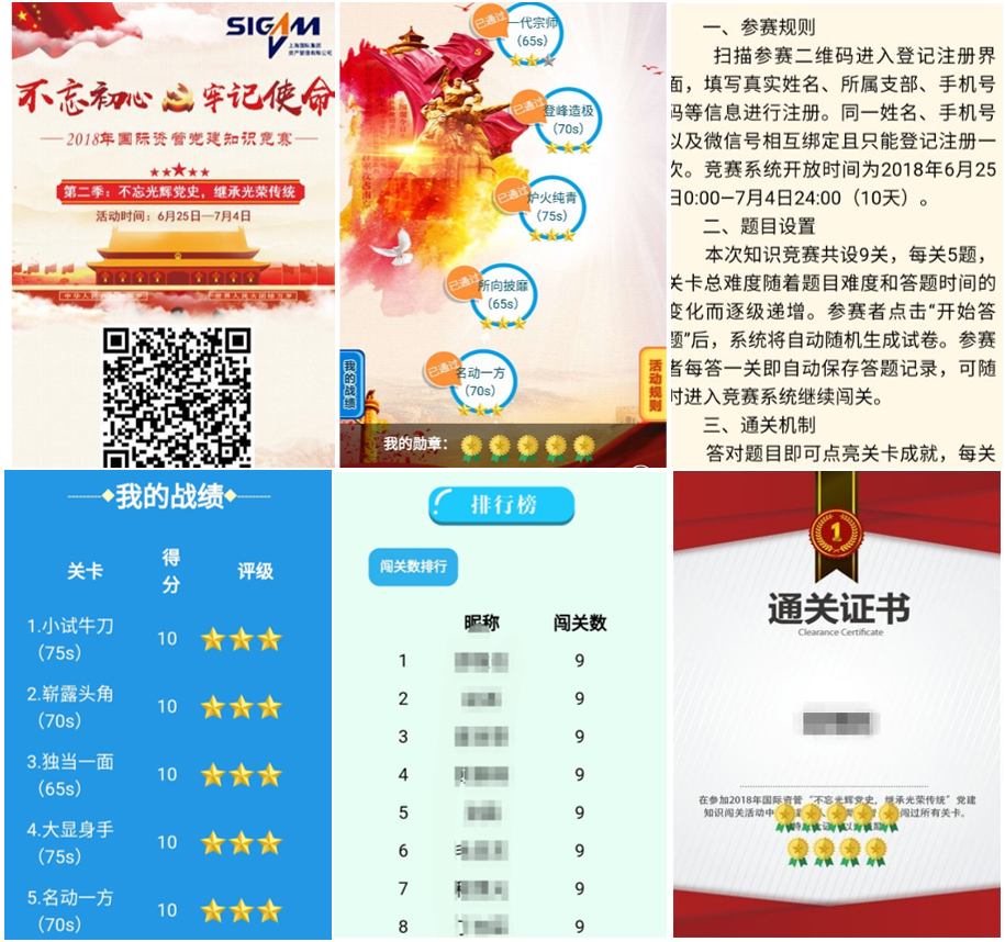 6月25日至7月4日,国际资管公司党委举办“不忘光辉党史,继承光荣传统”党建知识竞赛。竞赛紧紧围绕建党97周年的光辉历程和党章、党务工作的相关知识,依托微信平台,采取闯关形式开展竞赛。在10天的赛程中,公司党委所属10个支部和总支共计128位党员和群众参加了本次竞赛,共有55人闯过9关通关成功。