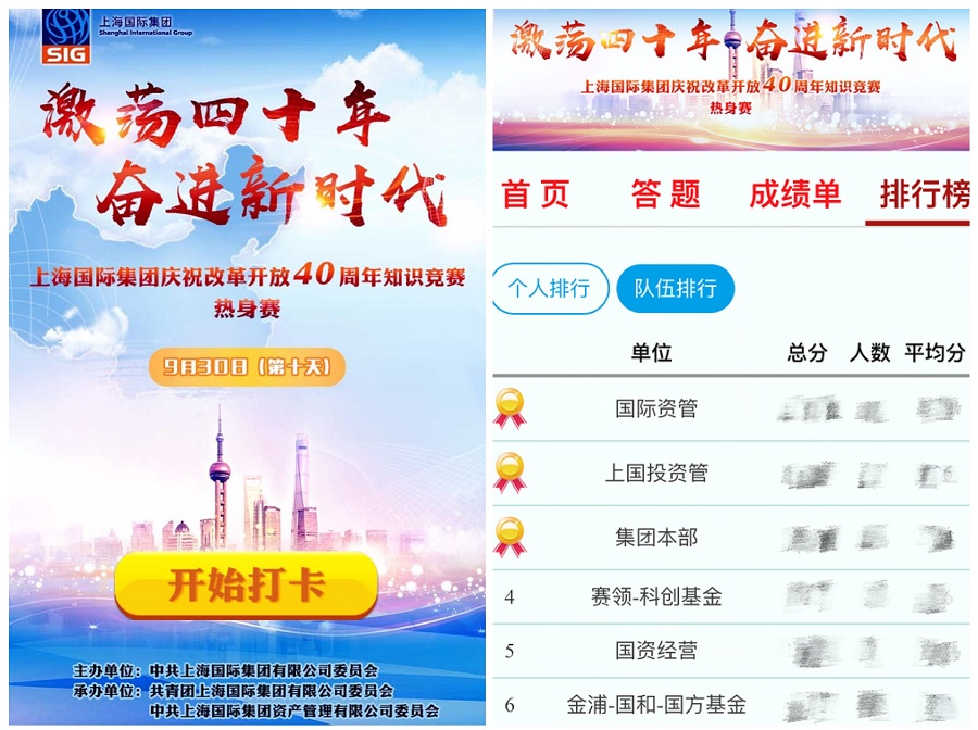 9月21日至30日,集团党委组织开展了2018年龙8集团“激荡四十年,奋进新时代”庆祝改革开放40周年知识竞赛网上热身赛,国际资管党委与集团团委共同承办了本次活动。在为期10天的赛程中,公司党委所属10个支部和总支共计77位党员群众参加了本次竞赛,并组建“国际资管”队和“金浦-国和-国方基金”队与集团系统其他参赛队伍进行了角逐,其中“国际资管”队的参与度、总得分和打卡满10天人数均位居集团系统第一名。